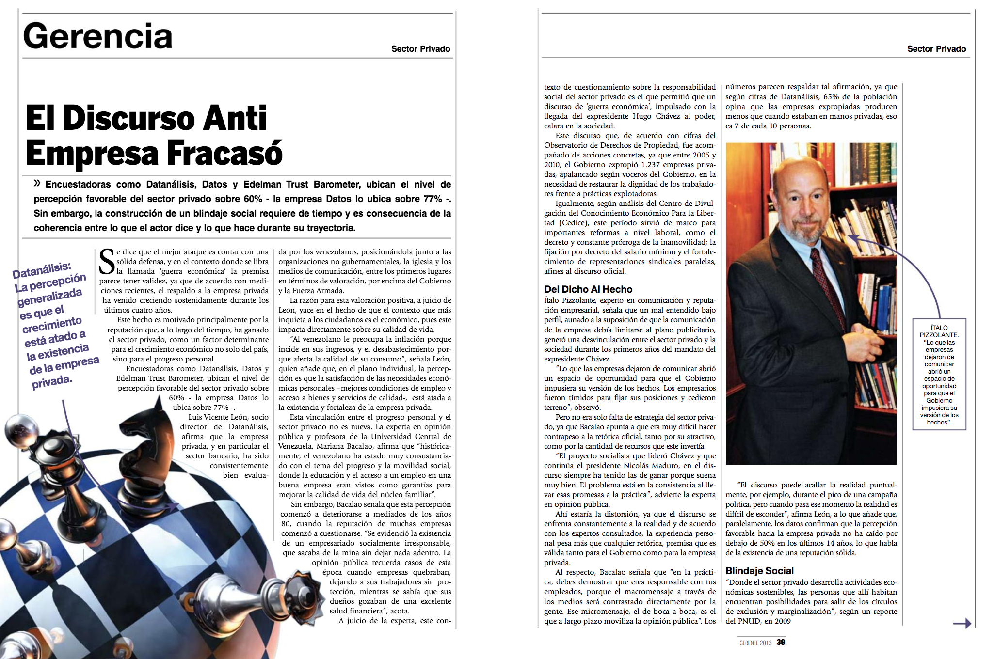 Ítalo Pizzolante, experto en comunicación y reputación empresarial, señala que un mal entendido bajo perfil, aunado a la suposición de que la comunicación de la empresa debía limitarse al plano publicitario, generó una desvinculación entre el sector privado y la sociedad durante los primeros años del mandato del presidente Chávez. “Lo que las empresas dejaron de comunicar abrió un espacio de oportunidad para que el Gobierno impusiera su versión de los hechos. Los empresarios fueron tímidos en fijar sus posiciones y cedieron terreno”, observó.