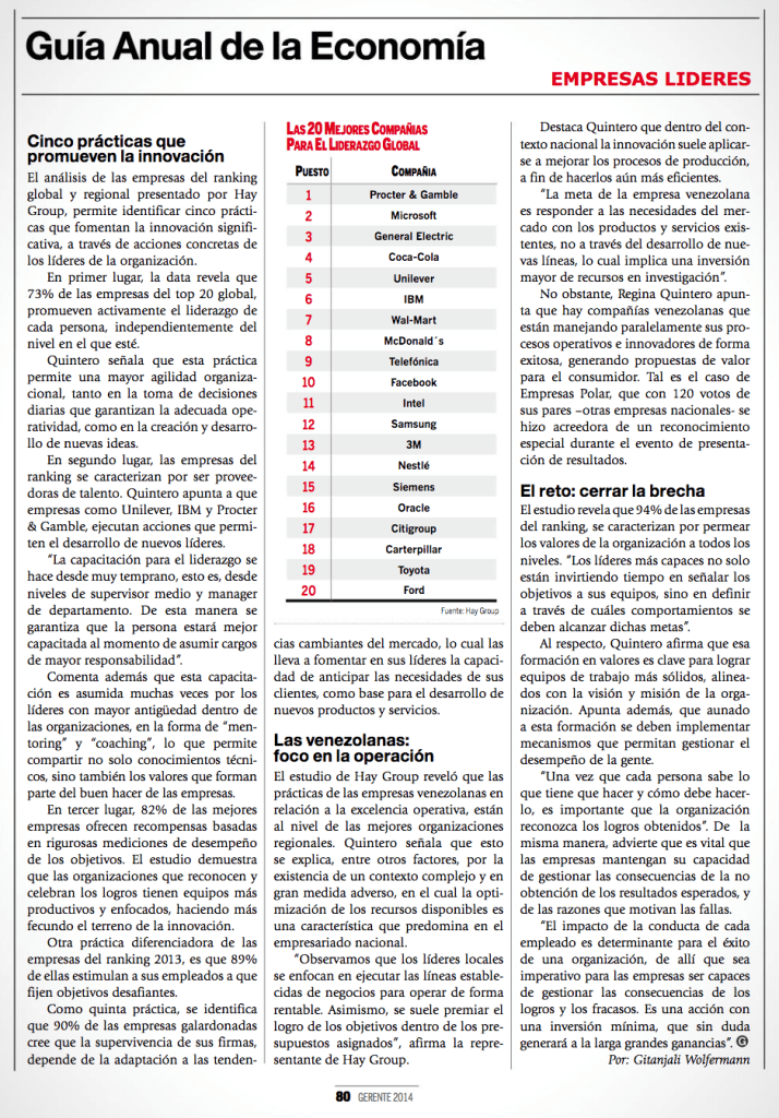La consultora internacional Hay Group realizó su octava entrega anual de las mejores compañías para el liderazgo. El evento realizado en Caracas contó con las ponencias de Marvi Cova, Gerente de RRHH de Nestlé, organización que ocupó el puesto 14 en el ranking global, de Mariela Rodríguez, HR Manager de Citibank, que se ubicó en la posición 18 y de María Guinand, Directora de Gestión de Gente de Empresas Polar, organización que recibió un reconocimiento especial.