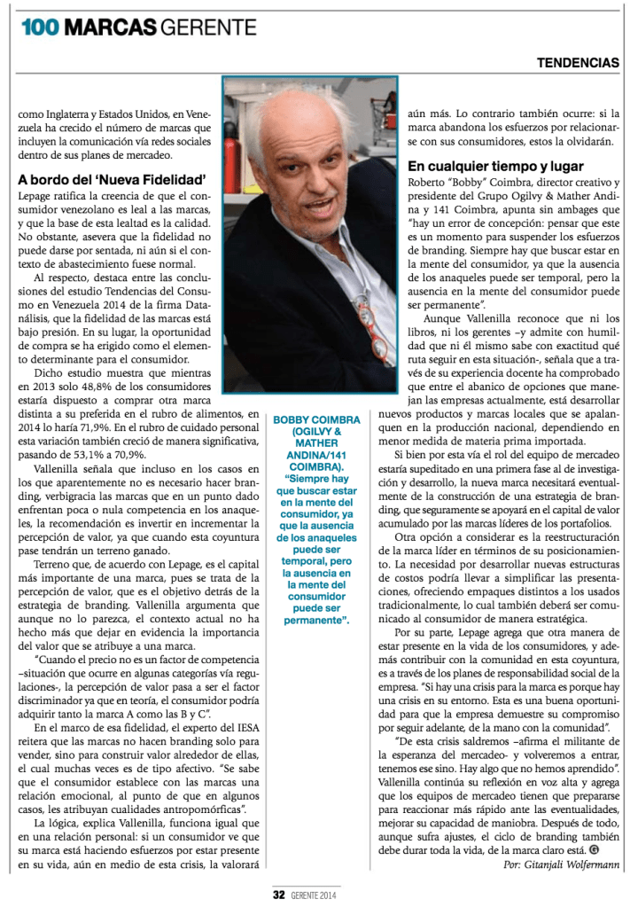 Roberto Coimbra, director creativo y presidente del Grupo Ogilvy & Mather Andina y 141 Coimbra, apunta sin ambages que “hay un error de concepción: pensar que este es un momento para suspender los esfuerzos de branding. Siempre hay que buscar estar en la mente del consumidor, ya que la ausencia de los anaqueles puede ser temporal, pero la ausencia en la mente del consumidor puede ser permanente”.