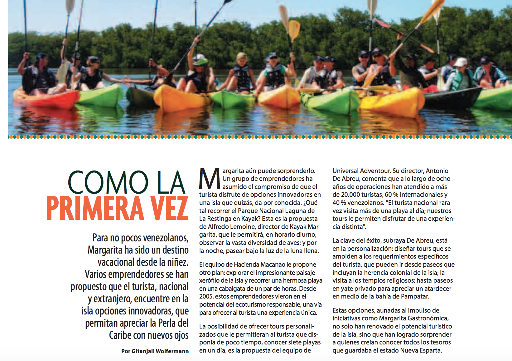 La posibilidad de ofrecer tours personalizados que le permitieran al turista que disponía de poco tiempo, conocer siete playas en un día, es la propuesta del equipo de Universal Adventour. Su director, Antonio De Abreu, comenta que a lo largo de ocho años de operaciones han atendido a más de 20.000 turistas, 60 % internacionales y 40 % venezolanos. “El turista nacional rara vez visita más de una playa al día; nuestros tours le permiten disfrutar de una experiencia distinta”.