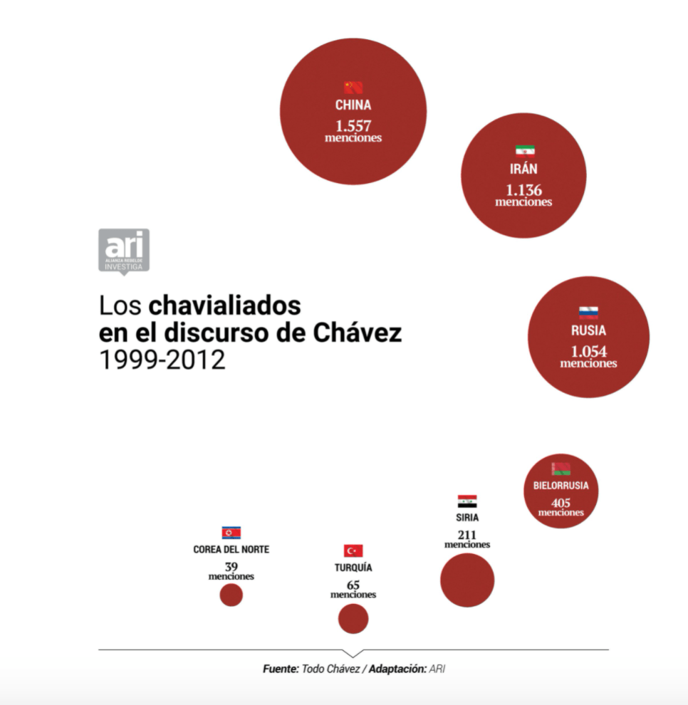 Sin importar la distancia geográfica, en el último lustro Venezuela ha reforzado alianzas con naciones que tienen en común su aversión contra EE.UU., gobiernos autoritarios con mandatarios con larga permanencia en el poder y altos índices de corrupción. La revisión de documentos oficiales disponibles, como gacetas y notas de prensa del Ministerio de Relaciones Exteriores, permite estimar que durante la era chavista, Venezuela ha firmado con estas naciones al menos unos 1.237 convenios, tratados y acuerdos de cooperación por un monto que ronda los $173 mil millones, aunque la opacidad que rodea estos negocios impide conocer la verdadera magnitud de los montos transados.